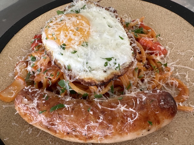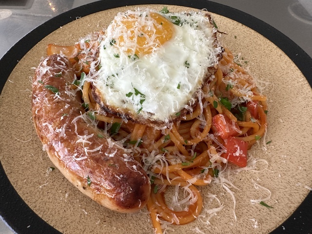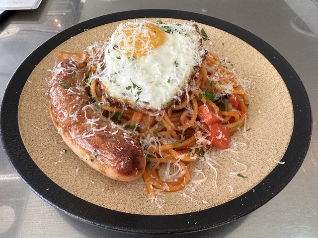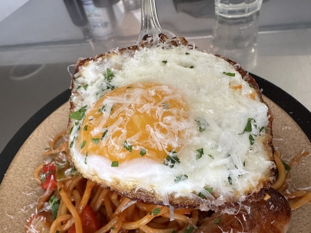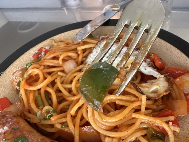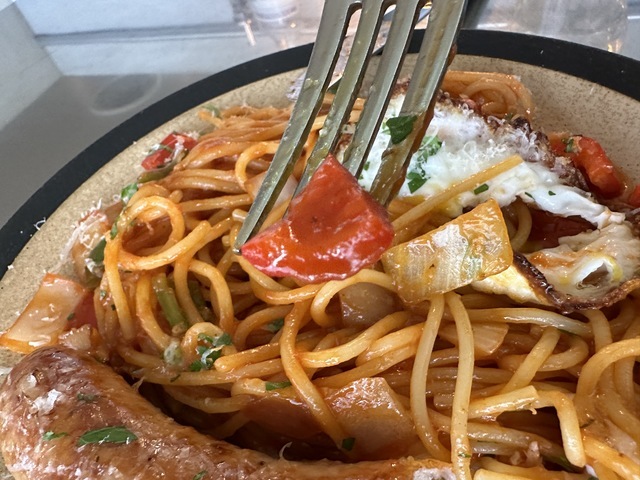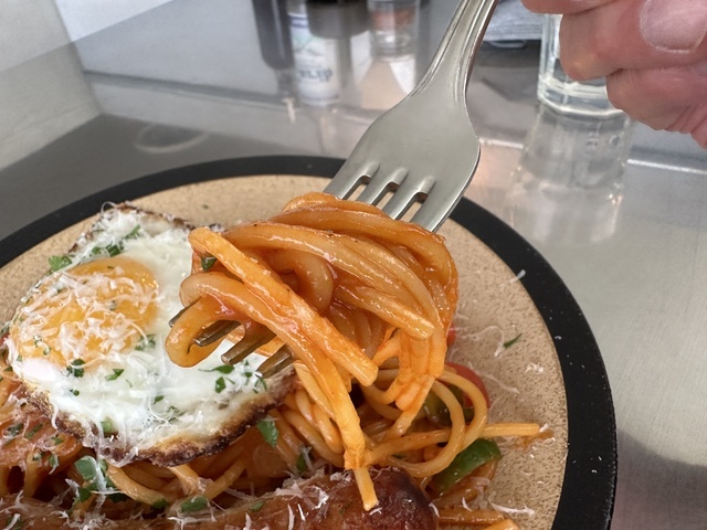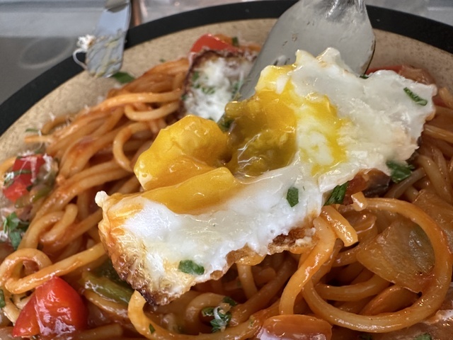 フォローする●2025年12月15日(月) 晴 12:09訪問 12:26着皿。 ●今回は、Instagramで見て鮮やかに感じた「THEナポリタン(並盛)1,485円」を注文して女性店員に写真撮影の許可を頂きました。 ●店内は、適度な音量のBGMが流れていましたが女性客が多くて会話の音が大きめに感じました。 ●テーブル席でお冷やを飲みながら待っていると17分後に発注した「THEナポリタン」が着皿しました。 ●THEナポリタンは、お皿にパスタ麺と麺の上にパプリカ、玉ねぎ、目玉焼き、ソーセージ、チーズが鮮やかに盛り付けてありました。 ●麺は、女性店員に確認したところ100gあり、もちもちした太麺でトマトソースとの相性が良くて美味しかったです。 ●ソーセージは、太くて大きなソーセージでナイフで切って食べたら美味しかったです。 ●代金の支払いでSuicaが使用できてJREポイントが付与されるので大変便利だと思いました。 ●美味しいおランチを味わう事ができるので、又、訪問したいと思います。ご馳走様でした。