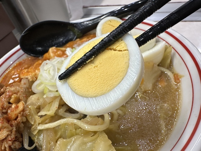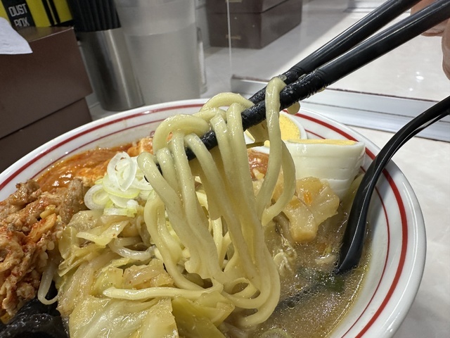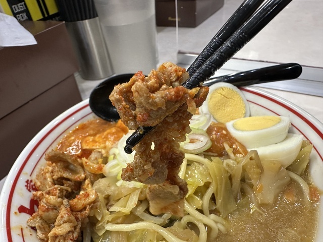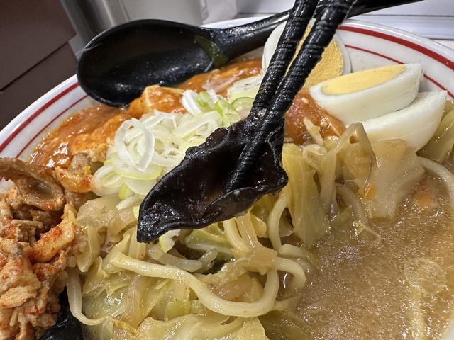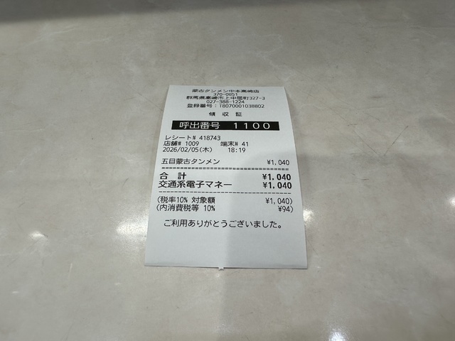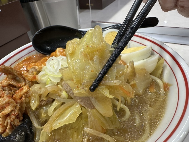 ●2026年2月5日(木) 晴 18:17訪問 18:24着丼。 ●今回は、「五目蒙古タンメン(7辛・大盛・麺345g)1,040円」を注文して店員に写真撮影の許可を頂きました。 ●麺の大盛は、クーポンを使用して無料で大盛にして頂きました。 ●カウンター席でお冷やを飲みながら待っていると7分後に発注した「五目蒙古タンメン」が着丼しました。 ●五目蒙古タンメンは、麺の上に豆腐、茹で玉子、キャベツ、もやし、ニンニク、豚肉、木耳、刻みネギがたっぷり盛り付けてありました。 ●先ずは、麺とスープの味見をしてから残りの麺を食べました。 ●麺は、腰があり食感の良い中太縮れ麺で美味しかったです。 ●麺の量は、店員に確認したところ345gありました。 ●スープの辛さは、7辛でしたが思っていたより辛さが控えめのピリ辛味噌スープで美味しかったです。 ●健康には、良く無いと思いながらスープを全部飲み干しました。 ●食券の購入でSuicaが使用できるので大変便利だと思いました。