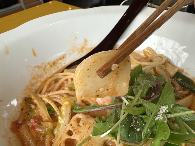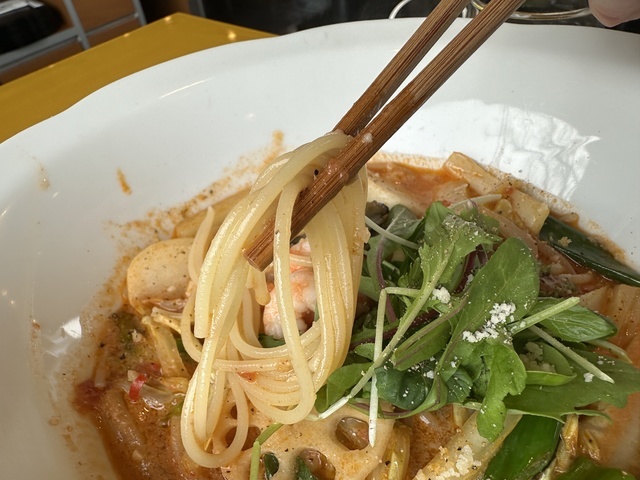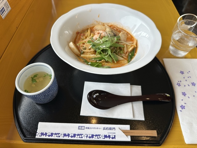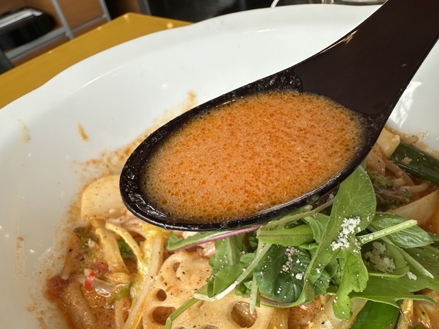 ●2026年2月8日(日) 晴 11:04訪問 11:17着丼。 ●今回は、期間限定のお勧めのと思われる「冬野菜と魚介のトマトスープパスタ(並盛・麺120g)1,350円」を注文して店員に写真撮影の許可を頂きましました。 ●テーブル席でお冷やを飲みながら待っていると13分後に発注した「冬野菜と魚介のトマトスープパスタ」がどんぶりで着丼しました。 ●食器は、珍しくフォークとスプーンではなく箸でした。 ●冬野菜と魚介のトマトスープパスタは、麺の上に牡蠣、海老、大根、白菜、水菜、蓮根、ネギ等が盛り付けてありました。 ●麺は、もちもちして食感の良い中太麺で美味しかったです。 ●麺の量は、店員に確認したところ並盛で茹で上げ前120gありました。 ●スープは、トマトの酸味が少し感じられるあっさりしたトマトスープで美味しかったです。 ●お吸い物は、出汁がきいて豆腐とネギの入った薄味のお吸い物で美味しかったです。 ●食券の購入でSuicaが使用できるので大変便利だと思いました。 ●美味しいパスタランチを味わう事ができるので、又、訪問したいと思います。ご馳走様でした。