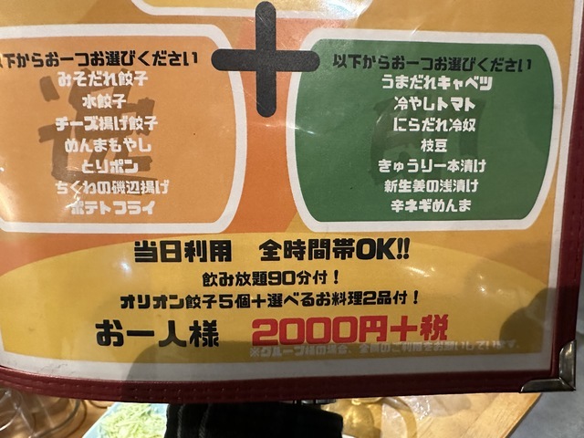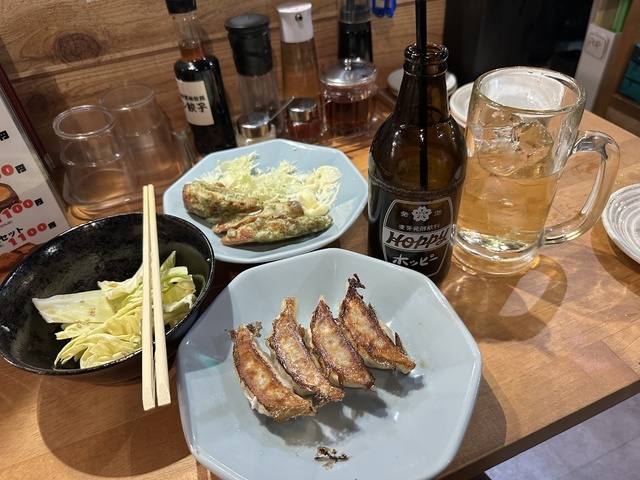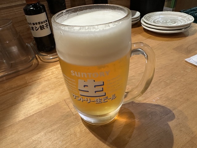 ●2026年2月18日(水) 晴 18:18訪問。 ●今回は、私の大好きな「0.5次回コース(90分飲み放題+料理3品)2,200円」を注文して店員に写真撮影の許可を頂きました。 ●先ずは、飲み放題の「生ビール」を頂きました。 ●生ビールは、飲み易くて美味しかったです。 ●料理は、コースの「オリオン餃子5個」と「ちくわの磯辺揚げ」と「うまだれキャベツ」を頂きました。 ●オリオン餃子は、お酒との相性が良くて餃子のお店だけあって美味しかったです。 ●飲み物の追加で飲み放題の「ホッピーセット(白)」を頂きました。 ●ホッピーは、癖がなくホップの香りがして美味しかったです。 ●ちくわの磯辺揚げは、お皿にキャベツとマヨネーズと揚げたてで熱々のちくわが5個盛り付けてありボリューム感があり食感が良くて美味しかったです。 ●うまだれキャベツは、お皿に新鮮なキャベツが盛り付けてあり、食感が良くて美味しかったです。 ●飲み物追加で飲み放題の「メガ角ハイボール(濃いめ)」を頂きました。 ●メガ角ハイボール(濃いめ)は、濃いめの角ハイボールがたっぷり入っていて美味しかったです。