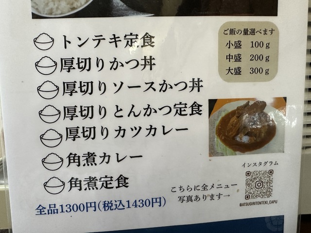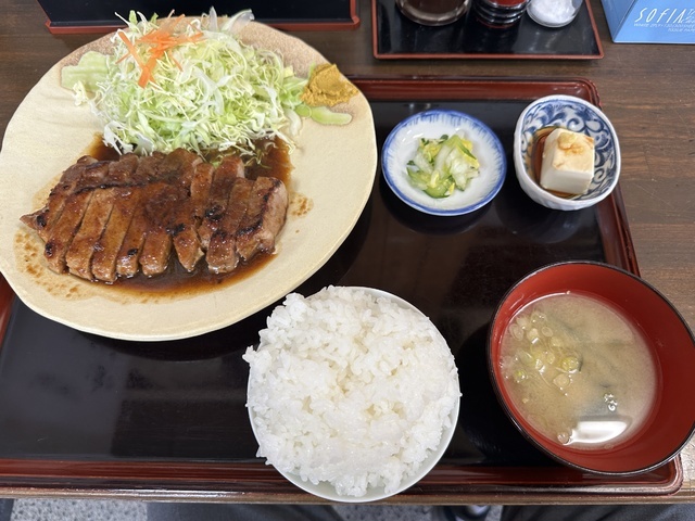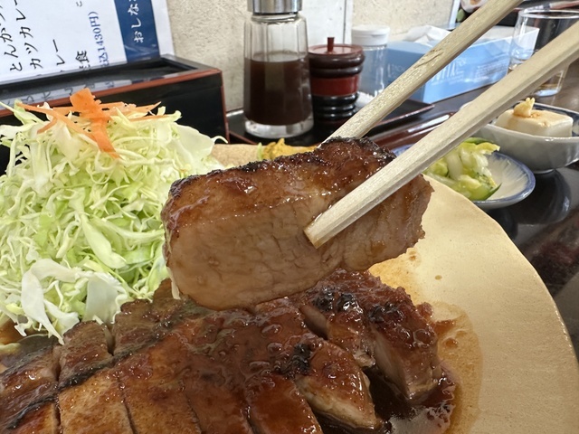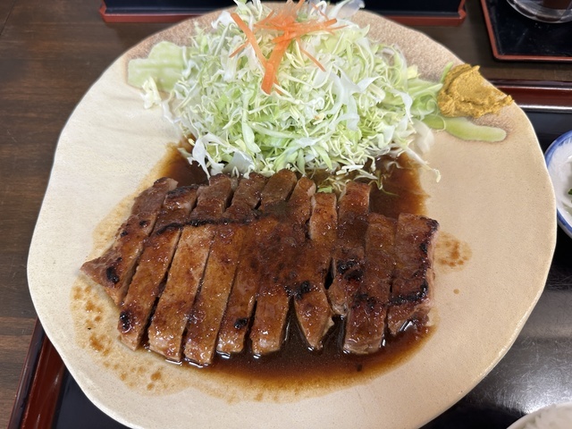 フォローする●2026年2月23日(月)晴れ。10:26に訪問し、10:52に着座、11:06に料理が提供されました。 ●今回は、メニューの一番上に記載されていたおすすめの「トンテキ定食(トンテキ+大盛りご飯300g+味噌汁+漬物+冷奴)1,430円」を注文し、写真撮影の許可もいただきました。 ●カウンター席でセルフサービスの冷たい麦茶を飲みながら待っていると、着座から14分後に「トンテキ定食」が提供されました。 ●トンテキは厚切りの肉と新鮮なキャベツがたっぷり盛られ、肉は柔らかく甘めのタレと相性抜群で、とても美味しかったです。 ●味噌汁はワカメと刻みネギが入った少し濃いめの味で、こちらも美味しくいただきました。 ●まずはトンテキをそのまま味わい、途中から辛子を付けて味の変化を楽しみました。 ●ご飯の上にトンテキをのせて“トンテキ丼”にして食べても美味しかったです。 ●漬物は白菜と胡瓜で、濃すぎない味付けがちょうど良く、美味しくいただけました。 ●他にもとんかつ定食やソースかつ丼など魅力的なメニューがあり、また訪問したいと思えるお店でした。ご馳走様でした。
