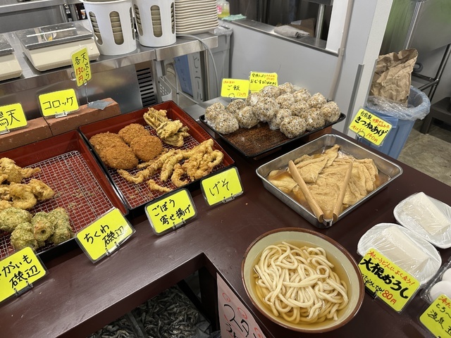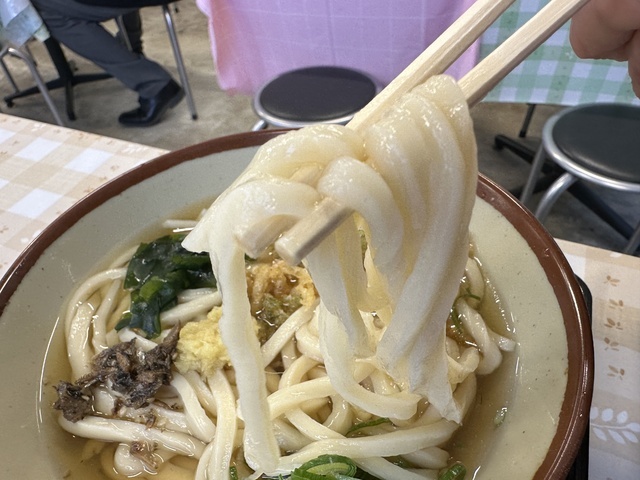 ●2026年4月4日(土) 曇 07:01訪問/07:11着膳 2026年33杯目(4月2杯目)の麺研究です。 ●今回は「うどん(2玉・麺400g・いりこだし)390円」+「ごぼう天130円」+「じゃがいも天130円」を注文。うどんをお湯で温め、いりこだしを注いでから会計(現金のみ)を済ませ、無料トッピングしてテーブル席へ。 ●だしは「いりこだし」と「かつおだし」の2種類があり、両方味見した結果、いりこだしを選びました。 ●麺はもちもち食感の極太麺で、とても美味しい。女性店員さんに確認したところ「1玉400g」とのことで、ボリュームも十分です。 ●スープはいりこだしがしっかり効いた、あっさり薄味の醤油仕立てで飲みやすい味わいでした。 ●ごぼう天はカラッと揚がっていて食感が良く、香ばしさが際立っていました。 ●じゃがいも天は柔らかいじゃがいもに青のりがかかっており、こちらも美味しかったです。 ●健康には良くないと思いながらも、スープをすべて飲み干してしまいました。 ●美味しいうどんをリーズナブルに味わえる良いお店だと思います。また訪問したいと思います。ご馳走様でした。