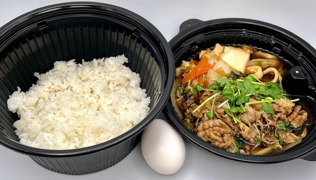 牛すき鍋膳が食べたくなりテイクアウトも出来るので行きました。生卵も卵の状態でカップに入って手渡されます。下にご飯、上に牛すき鍋で結構大きな容器です。味がしみたお豆腐とうどんが美味しいのです。クーポン券をいただいたので来月リピートしたいです。
