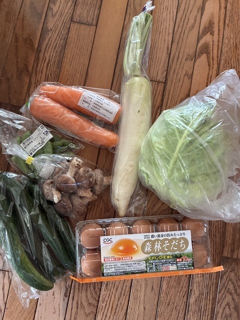春キャベツを買おうと手に取りナイロン袋の口を開けようとしてもなかなか開けられずにいたら、アルバイト?の学生スタッフさんに開けましょうか?と声をかけられて入れてもらいました。なんだかとても嬉しい気持ちになりました。他にスナップえんどう、卵、にんじんなど買いました。