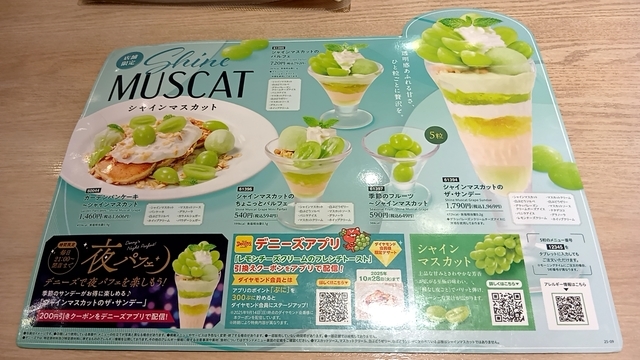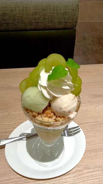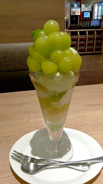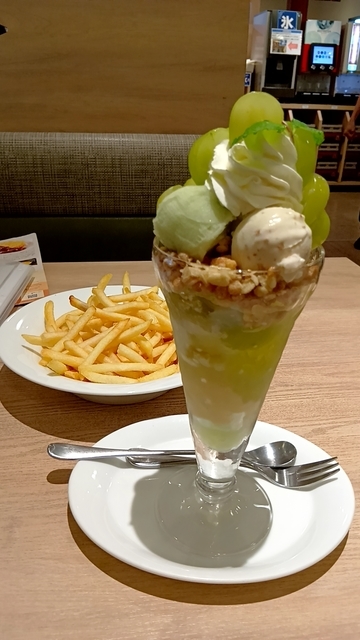 夜21時以降は、クーポン使えてシャインマスカットパフェ1790円が200円引きでした。 シャインマスカットパフェと山盛りポテト100円です。 甘くてみずみずしいシャインマスカットがたっぷり載り、盛りだくさんで美味しかったです。