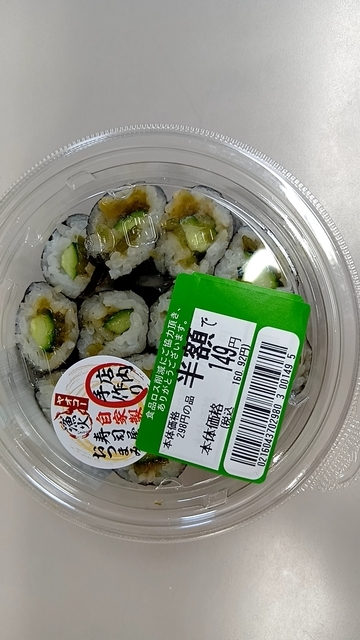 夜買い物に行ったら、すし半額で買えました。夕飯がまだだったので、安く買えて良かったです。初めて食べるのり巻きでしたが、ピリッと辛く美味しかったです。