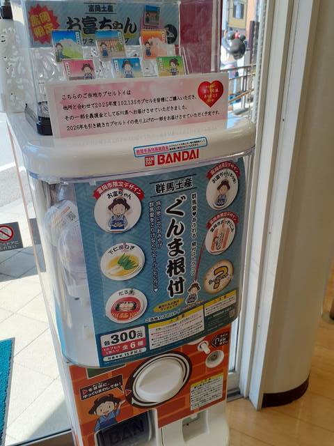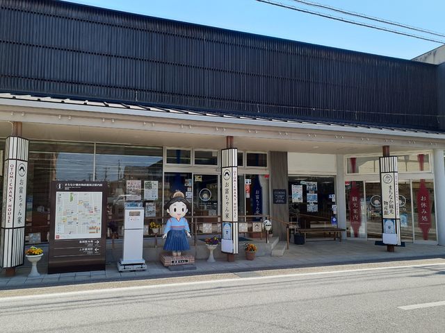 軒下のかわいいお富ちゃん像がお出迎え。中は物産品がならび、隣は観光案内所になっています。繭でつくったかわいいアートや、絹のブラシ類が種類豊富に並んでいました。