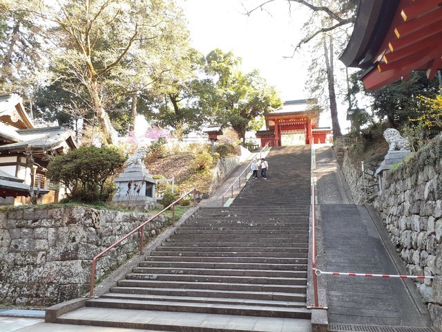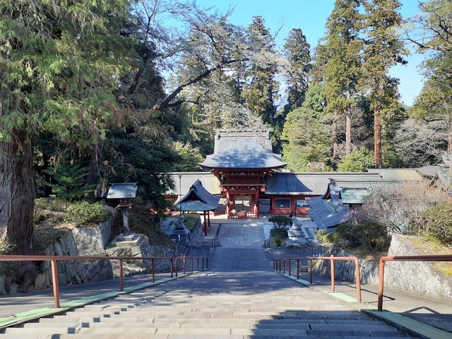 富岡まで来たら、立ち寄りたいのが貫前神社。下り参道を見て子どもが驚いていました。参道沿いの桜や山門前の桜は満開でした。いい時期に来られました。