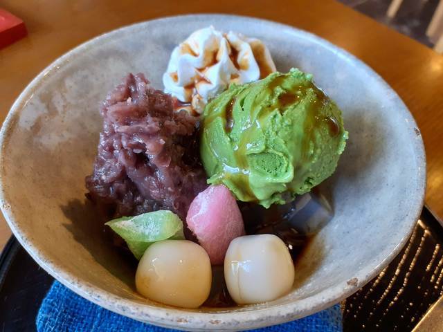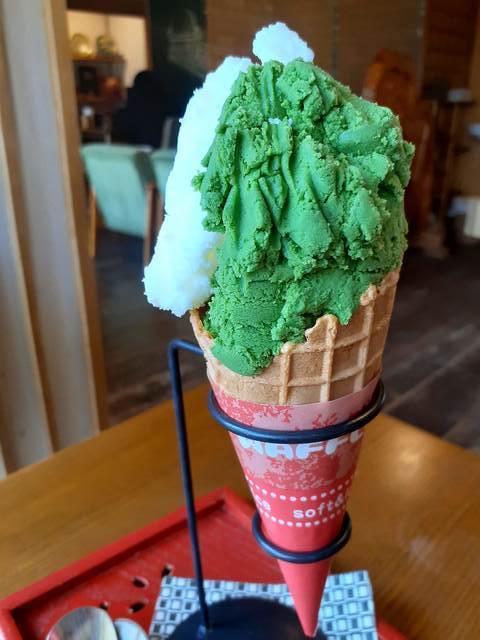 富岡プチ旅の最期はこちらでティータイム。ジェラート2色盛りと抹茶クリームあんみつをお願いしました。LINEの機能をつかってテーブルから注文するスタイルです。あんみつはあんこも美味しいし、抹茶アイスのほろ苦さとの相性もばっちり。上信電鉄のすぐ隣で、窓から可愛い列車が走る姿がよく見えます。いい眺めと甘味で旅のつかれが癒されました。