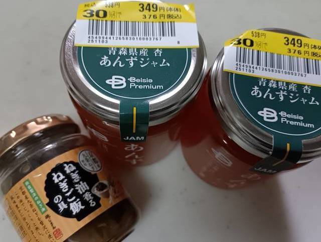 昨日、こちらのベイシアでお買い物しました!ジャムが欲しいと思って見ていたところ、運良くあんずジャムが値下がっていて嬉しかったです~!!思わず二つ購入しました。笑 早速無糖のヨーグルトと共にいただきましたが、甘酸っぱくてとても美味しかったです!こちらのシリーズのジャムは国産食材を使用していたり、量も多く気に入っています♪ 他にもご飯のお供になりそうな「ねぎご飯の具」を買ってみました。夫が早速食べていましたが、ご飯が進むと喜んでいました!