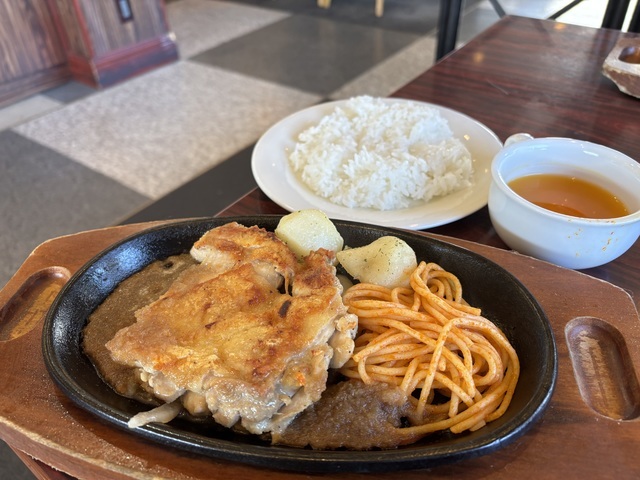 土日祝は10:30開店笑!モーニングのような時間にきて貸切利用。広沢は古いながら地元密着型でファンが多い。特に最近店舗限定で、パンの食べ放題を開始し、実際にショーケースに入ったパンが食欲をそそる飾り方で食べたくなった。頼んだのはLチキングリル240g!タレは宮のタレ強選択、そして単品サラダバー。クーポンでチキングリルは¥50引き&チキンが大きくなりましたとの事。ランチはスープバー付きなのでにんじんスープ、アサリたっぷりクラムチャウダー、鶏肉としいたけのスープを心ゆくまで飲んだ。サラダバーは前回までと同様冬メニュー。レタスは芯ごと入っててザク切りだった!これだけで満腹満腹〜。そしてチキン登場!確かにいつもより大きなサイズに良い感じの焦げ目がそそる。皮がパリパリに焼かれててたまらないビジュアル!この香りと音、そしてご飯が進む味付け!肉を味わい尽くす至福の時!付属のポテトは大きくてホクホクだし、ナポリタンもしつこくない。美味しかったです