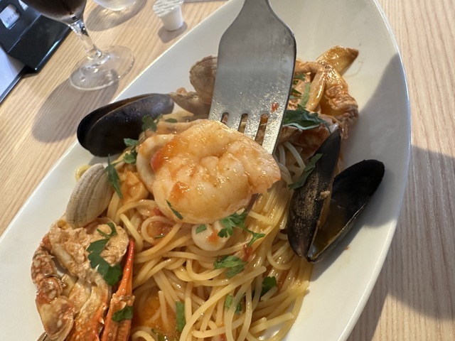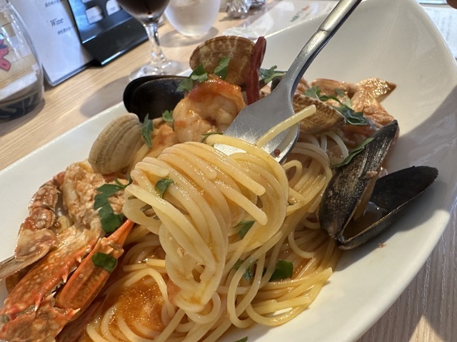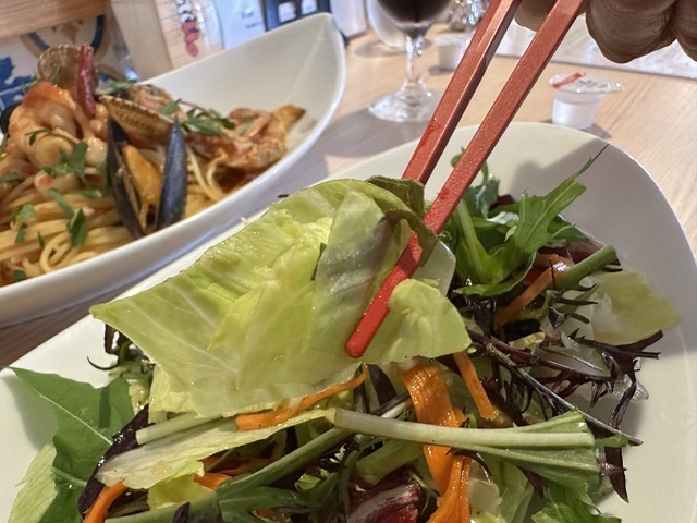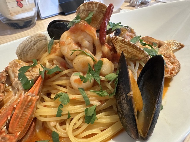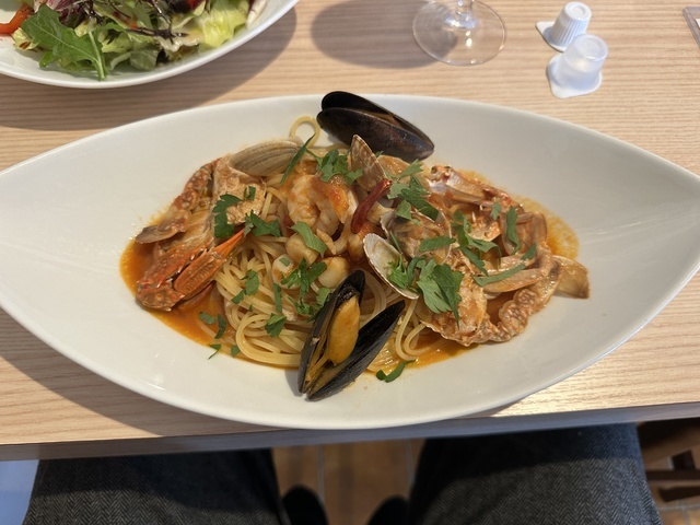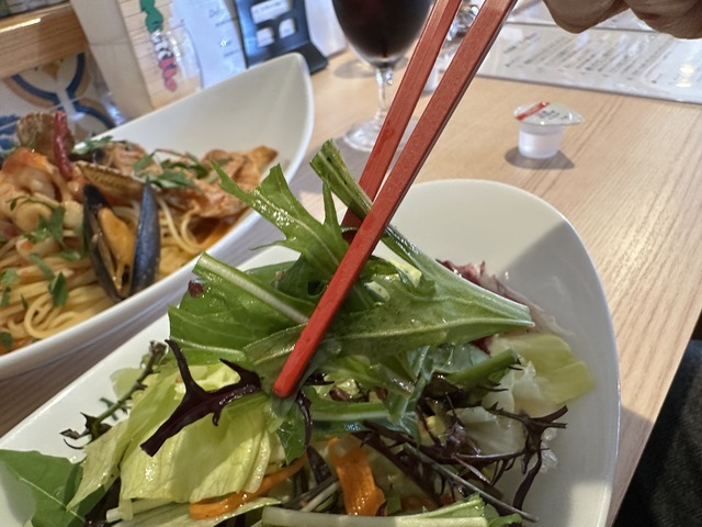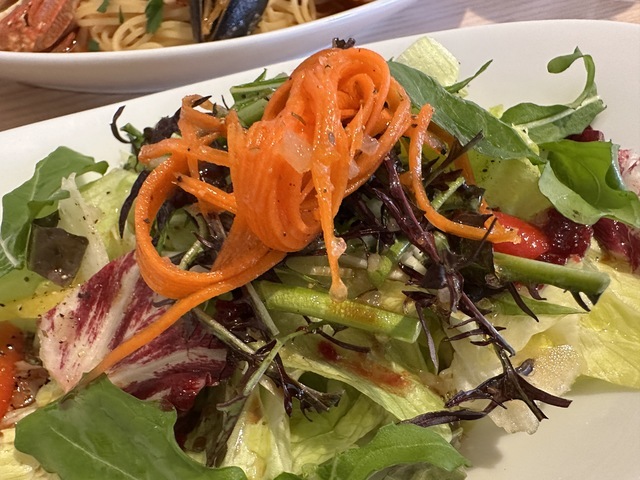 ●2026年1月18日(日) 晴 11:15訪問 11:31着皿。 ●今回は、女性店員に確認したお勧めの「3.魚介たっぷりペスカトーレサラダセット(パスタ100g+野菜サラダ+アイスコーヒー)2,000円」を注文して写真撮影の許可を頂きましました。 ●カウンター席でお冷やを飲みながら待っていると16分後に発注した「魚介たっぷりペスカトーレパスタ」が着皿しました。 ●魚介たっぷりペスカトーレパスタは、細麺パスタの上にエビ、イカ、ホタテ、蟹、ムール貝、あさり、鷹の爪等の魚介がたっぷりが盛り付けてありました。 ●麺は、もちもちした細麺で魚介の具とトマトベースのスープとの相性が良くて美味しかったです。 ●野菜サラダは、レタス、水菜、ニンジン、黄パプリカ、赤パプリカ等の野菜が鮮やかに盛り付けてあり、ボリュームがあり酢のきいたドレッシングとの相性が良くて美味しかったです。 ●アイスコーヒーは、美味しかったのでブラックで飲みました。 ●代金の支払いでd払いが使用できるので大変便利だと思いました。 ●美味しいイタリアンのランチを味わう事ができるので、又、訪問したいと思います。ご馳走様でした。 (投稿:2026/01/18 掲載:2026/01/19)