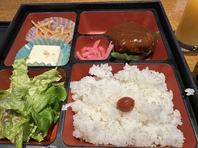 ●2026年3月30日(月) 曇 12:05訪問/12:16着箱。 ●今回は「ビーフハンバーグランチ(ハンバーグ+ライス+味噌汁+野菜サラダ+冷奴+漬物)850円」を注文。写真撮影の許可も女性店員さんからいただきました。 ●セルフサービスのオレンジジュースを飲みながら待っていると、11分後に「ビーフハンバーグランチ」が着箱。 ●ビーフハンバーグは厚みがあり、柔らかい食感で、デミグラスソースとの相性が良く美味しかったです。 ●野菜サラダはドレッシングがよく合い、味噌汁は麩とワカメ入りの薄味で飲みやすかったです。 ●ドリンクのおかわりで「グレープフルーツジュース」もいただきました。 ●支払いにPayPayが使える点も便利で良いと思いました。 ●他にも魅力的な定食が多く、また訪問したいと思います。ご馳走様でした。 (投稿:2026/04/01 掲載:2026/04/01)