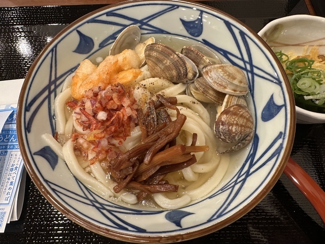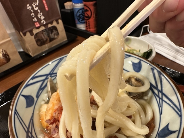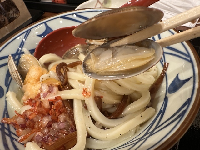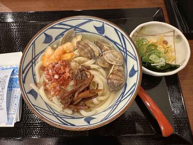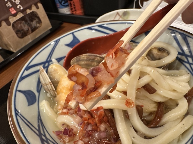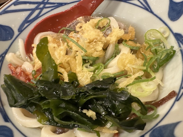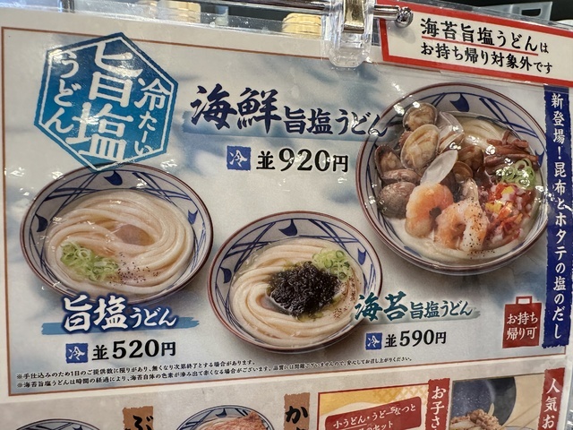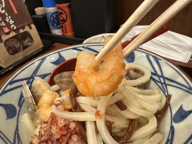●2025年8月11日(日) 晴 10:10訪問 10:55注文 10:57着膳。 ●10:30開店の20分前に訪問したのですが既に先客50人位が店外で並んでいて、駐車場も残り僅かでした。 ●今回は、期間限定メニュー「海鮮旨塩うどん(並盛)920円」を注文して女性店員に写真撮影の許可を頂きました。 ●注文してから着膳までに約2分かかかりました。 ●海鮮旨塩うどんは、麺の上にエビ、アサリ、揚げ玉ねぎ、フキ等が盛り付けてありました。 ●先ずは、麺とスープの味見をしてから残りの麺を食べました。 ●麺は、もちもちして食感の良い極太麺で美味しかったです。 ●スープは、出汁がきいてあっさりした冷たい塩スープで美味しかったです。 ●最初は、そのまま食べてお店の味を楽しみ、少し食べたら薬味を入れて食べて別の味を楽しみました。。 ●健康には、良くないと思いながらスープ割りを全部飲み干しました。 ●家族へのお土産として「すだちおろしぶっかけうどん(並盛)550円×3個」と「うどーなつ(チョコ味)350円」と「うどーなつ(きなこ味)300円」をテイクアウトしました。 (投稿:2025/08/11 掲載:2026/04/06)