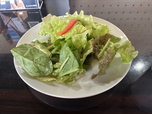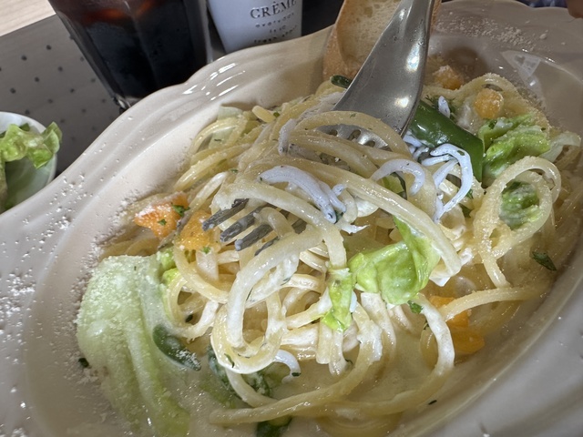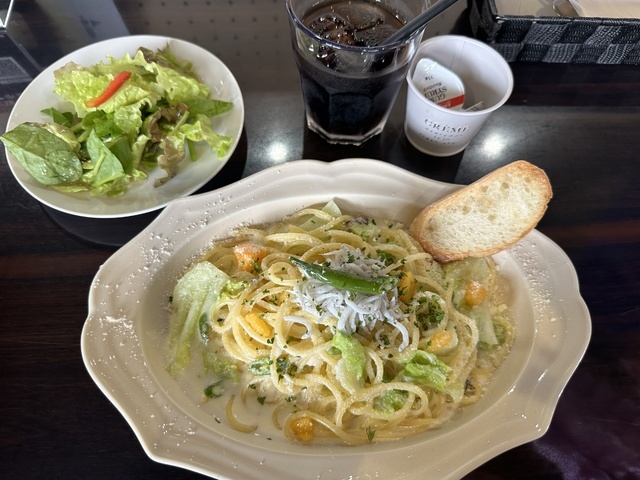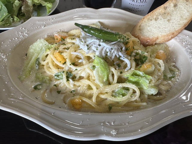 ●2025年11月1日(土) 晴 10:42訪問 11:01着座 11:13着皿。 ●今回は、2025年11月限定「青唐辛子としらすのバタークリームパスタ(並盛・麺120g)1,400円」と「Aセット(野菜サラダ+アイスコーヒー)440円」を注文して女性店員に写真撮影の許可を頂きました。 ●テーブル席でお冷やを飲みながら待っていると着座してから12分後に発注した「青唐辛子としらすのバタークリームパスタ」が着皿しました。 ●青唐辛子としらすのバタークリームパスタは、太麺120gの上に青唐辛子、しらす、キャベツ等が盛り付けてあり、適度な辛さとバタークリームの甘さがマッチして美味しかったです。 ●麺の量は、女性店員に確認したところ茹で上げ前で120gありました。 ●野菜サラダは、レタスとパプリカ等が盛り付けてあり、少し甘くて酸っぱいドレッシングとの相性が良くて美味しかったです。 ●アイスコーヒーは、美味しかったのでブラックで頂きました。 ●代金の支払いてわSuicaが使用できるので大変便利だと思いました。 ●美味しいランチを味わう事ができるので、又、訪問したいと思います。ご馳走様でした。 (投稿:2025/11/02 掲載:2025/12/02)