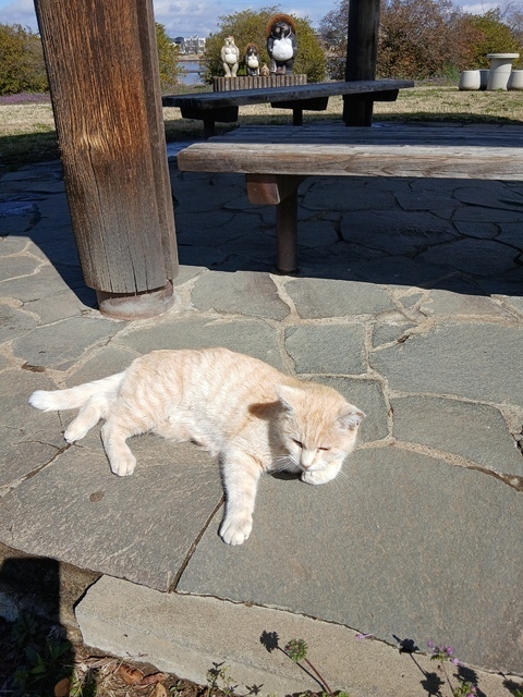 今日は、3月4日(木)の平日です。本日の朝方まで降っていた雨が上がって、とても晴れていたので、散歩に来ました。少し風が吹いて寒かったのですが、歩いていると気持ち良かったです。公園の白梅、紅梅、しだれ梅が咲いていて、ロウバイもかなり散ってはいますが、咲いていていい香りを漂わせています。一部陽だまりのところの桜が咲いていて、とてもきれいでした。陽だまりついでに、公園のベンチでは、ネコさんも気持ちよく、寝そべっていて、挨拶をすると、あいさつを返してくれます。とてもかわいいネコさんでした。 (投稿:2026/03/04 掲載:2026/03/06)