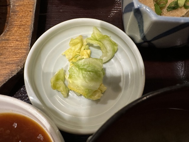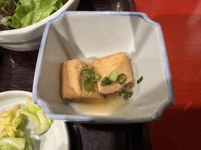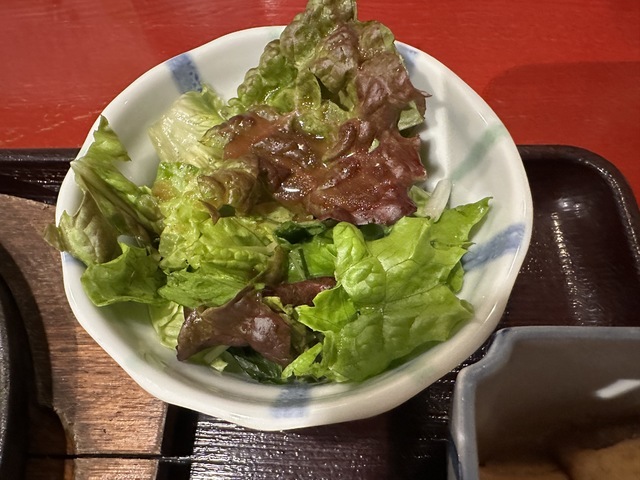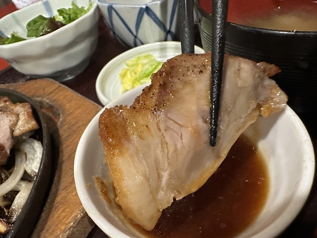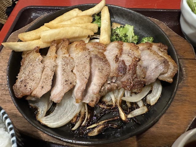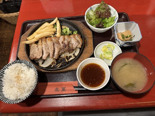 ●2026年4月29日(水) 曇り。11:02訪問、11:17着膳。 ●今回は、日替わりランチメニューのお勧め「厚切りロース鉄ぱん焼きランチ(鉄ぱん焼き+ご飯+味噌汁+野菜サラダ+漬物+小鉢+アイスコーヒー)1,050円」を注文し、写真撮影の許可もいただきました。 ●温かいお茶を飲みながら待っていると、着座から15分ほどで「日替ランチ」が着膳。 ●本日(水曜日)の日替わりは「厚切りロース鉄ぱん焼きランチ」でした。 ●厚切りロース鉄ぱん焼きは、玉ねぎ・ブロッコリー・ポテトフライと共に鉄板にたっぷりのお肉が盛られ、タレをつけて食べるとお肉が柔らかくてとても美味しかったです。 ●味噌汁はワカメのみのシンプルな具材ながら、出汁がしっかり効いていて美味しい味噌汁でした。 ●野菜サラダは量は控えめですが、ドレッシングとの相性が良く美味しくいただけました。 ●漬物は薄味で食べやすく、小鉢の厚揚げは柔らかくヘルシーで優しい味わいでした。 ●アイスコーヒーはブラックでいただき、すっきりとした味わいで美味しかったです。 ●この内容で1,050円という価格は、非常にコストパフォーマンスが高いと思います。 (投稿:2026/04/29 掲載:2026/04/30)