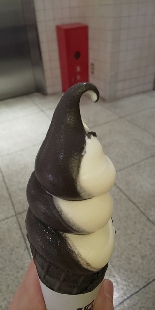 北海道展が昨日から始まりました。 コーヒー屋さんのソフトクリーム、ミックス500円です。チョコレートと竹炭だそうで、真っ黒ですが、チョコのよい香りがしました。 (投稿:2021/03/25 掲載:2021/03/25)