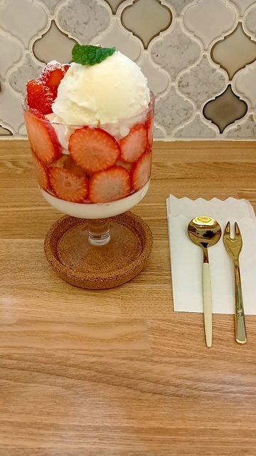 いちごパフェ1200円です。 薄切りいちごがグラスに並び、かわいいです。バニラアイス、シフォンケーキも入り、美味しかったです。 (投稿:2026/03/03 掲載:2026/03/04)