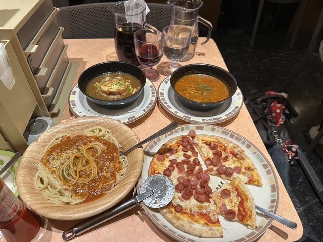 ●2026年3月16日(月) 晴れ。19:34に訪問し、19:37に着座しました。 ●今回は「赤ワインデカンター(大・500ml)400円」と「白ワインデカンター(大・500ml)400円」を注文し、女性店員さんに写真撮影の許可をいただきました。 ●赤・白ともに適度な酸味と渋みがあり、飲みやすいワインでした。 ●料理は「ソーセージピザ 400円」「たまねぎのズッパ 300円」「たまねぎのズッパ 300円」「ミートソースボロニア風パスタ 400円」をいただきました。 ●どの料理もリーズナブルながらボリュームがあり、食べ終える頃にはお腹がいっぱいになりました。 ●会計ではSuicaが利用でき、さらにヤマダポイントも付与されるため、とても便利だと感じました。 ●手頃な価格でお酒と料理を楽しめるお店なので、また訪問したいと思います。ご馳走様でした。 (投稿:2026/03/18 掲載:2026/03/18)