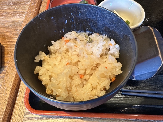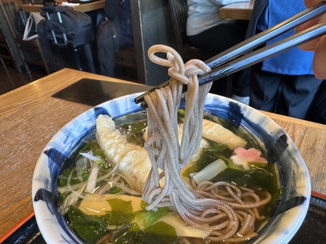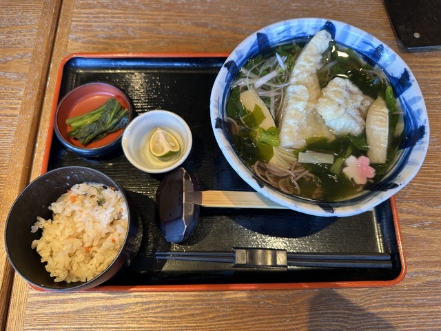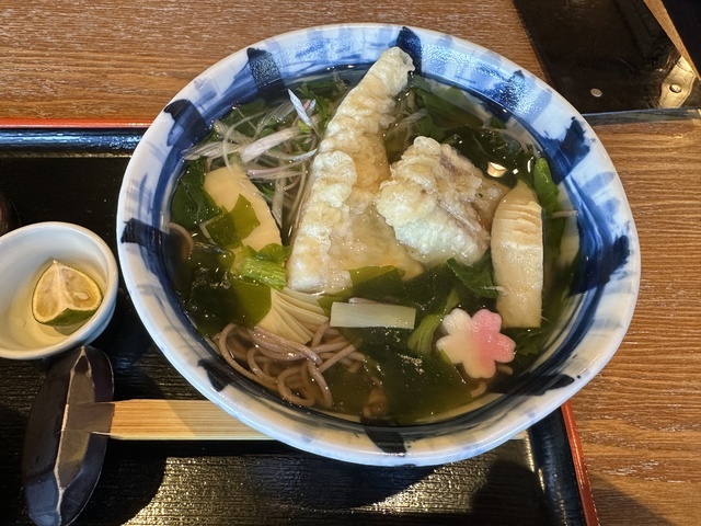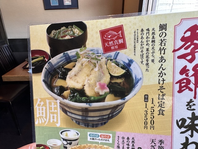 ●2026年3月17日(火) 晴れ。12:09に訪問し、12:19に着膳しました。 ●今回は期間限定メニューの「鯛の若竹あんかけそば定食(温かいそば+炊き込みご飯+漬物)1,550円」を注文し、女性店員さんに写真撮影の許可をいただきました。 ●温かいお茶を飲みながら待っていると、注文から10分後に料理が提供されました。 ●鯛の若竹あんかけそばは、天然真鯛の天ぷら、鳴門ワカメ、筍、菜の花、麩などが盛り付けられ、春らしい彩りの一杯でした。 ●まずは麺とスープの味を確かめ、その後に炊き込みご飯と合わせていただきました。 ●麺は少し柔らかめながら、もちもちとした食感の中細麺で美味しかったです。 ●スープは素材の味を活かした薄味の醤油仕立てで、あっさりとした優しい味わいでした。途中でライムを搾ると爽やかな風味が加わり、また違った味を楽しめました。 ●炊き込みご飯は細かく刻んだ野菜が入り、柔らかく薄味で食べやすかったです。 ●健康には良くないと思いながらも、スープをすべて飲み干してしまいました。 ●会計ではSuicaが利用でき、JREポイントも付与されるため大変便利だと感じました。 (投稿:2026/03/18 掲載:2026/03/18)