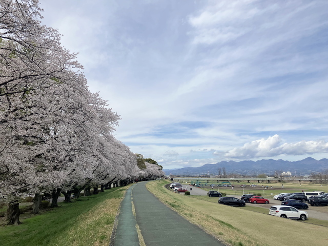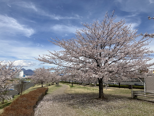 烏川の桜が咲いているのを見た覚えがなく、初のお花見に。対岸に行こうとしたらこちらにも咲いていたので寄りました。ずいぶん散っていましたが本数があるので楽しめました。ベンチがいくつかあってお花見をのんびり楽しむ方も。 (投稿:2026/04/05 掲載:2026/04/06)