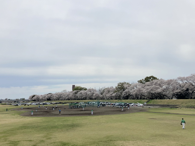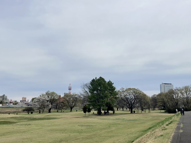 今日は八千代橋を渡ってこちらへ。暖かな今日は元気に遊具で遊ぶキッズでにぎわっていました。広い芝生広場と遊具がメインですが、写真の左手に1本だけソメイヨシノが咲いていました♬ (投稿:2026/04/05 掲載:2026/04/06)