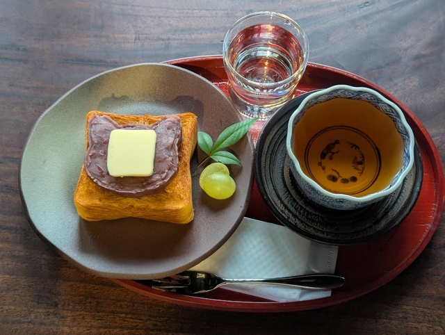 板鼻の通りにできた古民家カフェです。 中に入ると広くて、造りが素敵でした。和の小物などが並んでいて、建物に合います。 お茶とお菓子のセットで500円です。アンバタートーストとほうじ茶にしました。ねこ型のあんこがかわいかったです。食器も素敵でした。 (投稿:2025/04/14 掲載:2026/04/08)