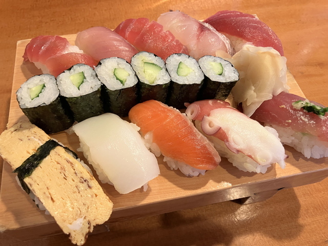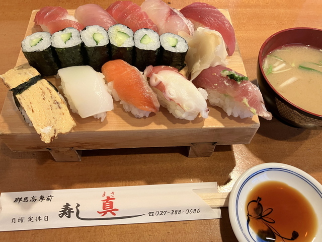 高崎の情報紙「ちいきしんぶん」最新号で紹介されたので、そば屋をお休みして混む前に訪問。早めに着いたのに先客数名、11時には空き待ちのにぎわいでした。今回も9割のお客さんが注文するという「ランチにぎり(特)」を。カウンター席で待つ間にご店主のお仕事を見るのも楽しいですね。にぎり10貫、かっぱ1本にしじみの味噌汁です。マグロ、イナダ、サーモン、タコ、イカなどネタはどれも上質。コシヒカリをやや硬めに炊いたというしゃりもいい。ご店主と奥さんの連係プレーに若い女性も加わりました。この美味しさが税込990円とはありがたい限り。ごちそうさまでした♬ (投稿:2026/04/18 掲載:2026/04/20)