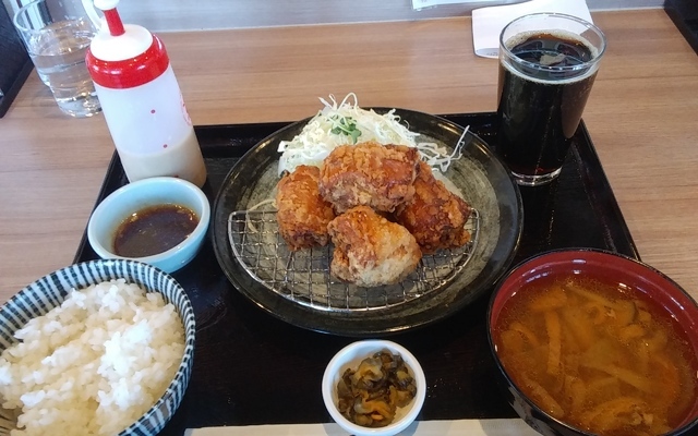 クリスマスと言えばチキン。どうせなら、それで1食済ませたい。という事で唐揚げ定食です。安易です(^-^)。これまでの写真は、ささみ唐揚げとの合い盛りや、1枚唐揚げカレーでしたが、これが基本の唐揚げ4個の定食です。それと食事をすると貰えるドリンク券でアイスコーヒー。選べる付けダレは油淋鶏にしました。揚げたて熱々をカリッと噛めばジュワッと肉汁。間髪入れずササニシキのご飯を頬張る。美味しいったら無いです。今年ここに何回来たかなあ? 来年も確実にお世話になる事でしょう。 (投稿:2020/12/24 掲載:2020/12/24)