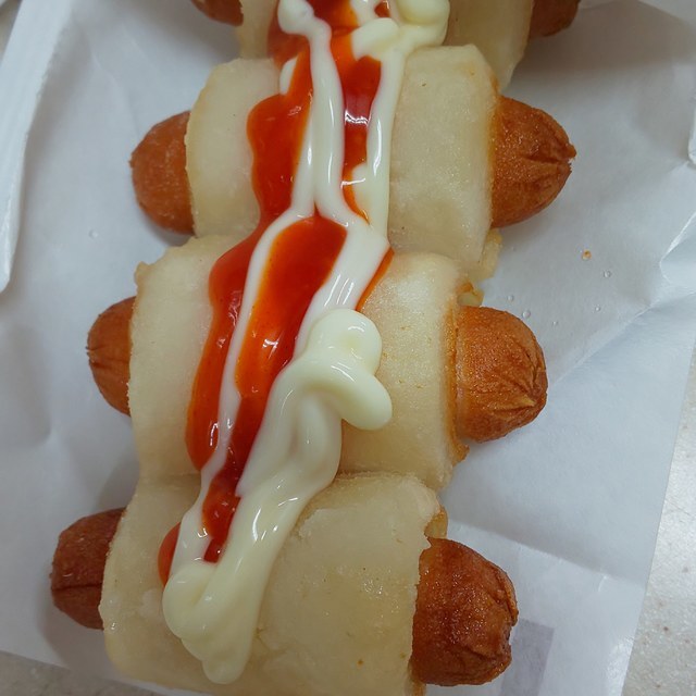 ソトクソトクという食べ物。韓国で人気のある食べ物だそうです。 ウインナーにトッポギが巻いてあり、揚げてありました。珍しいですね。 (投稿:2020/10/15 掲載:2020/10/15)