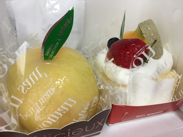 午後のティータイムに主人がサプライズで買ってきてくれました。前から食べてみたかった季節限定の桃のケーキとフルーツのロールケーキです。桃のケーキはスポンジの上に種が取り除かれた桃が真ん丸一個のっていて、その中にはクリームが入っていました。クリームは、生クリームではなく、どちらかといえばカスタードに近いです。甘いクリームと甘酸っぱい桃がよく合って美味しくいただきました。フルーツロールはスポンジと生クリームにフルーツというシンプルな見た目ですが、きめ細かなスポンジと程よい甘さのクリームで、とても美味しかったです。 (投稿:2020/07/25 掲載:2020/07/27)