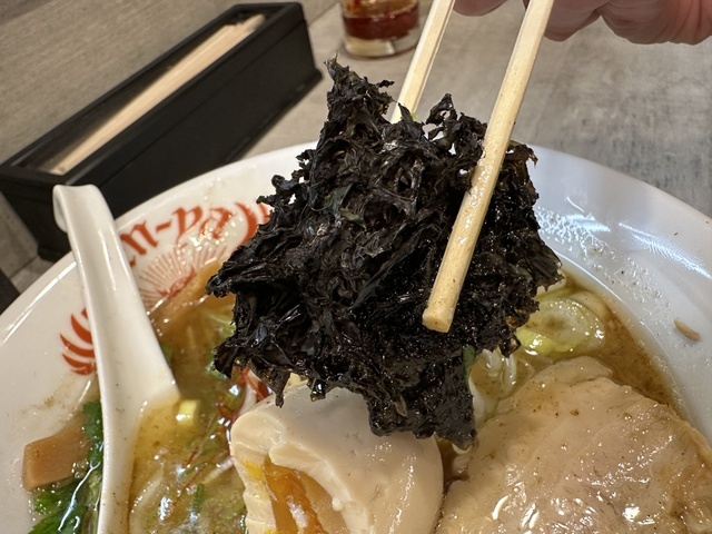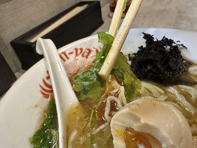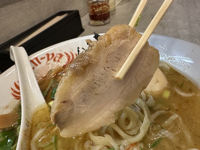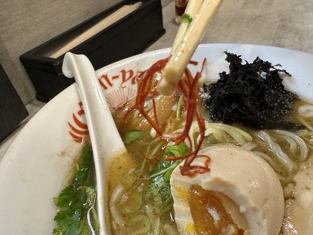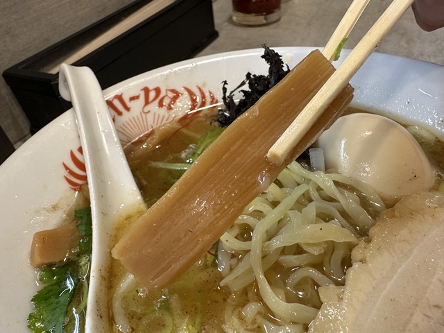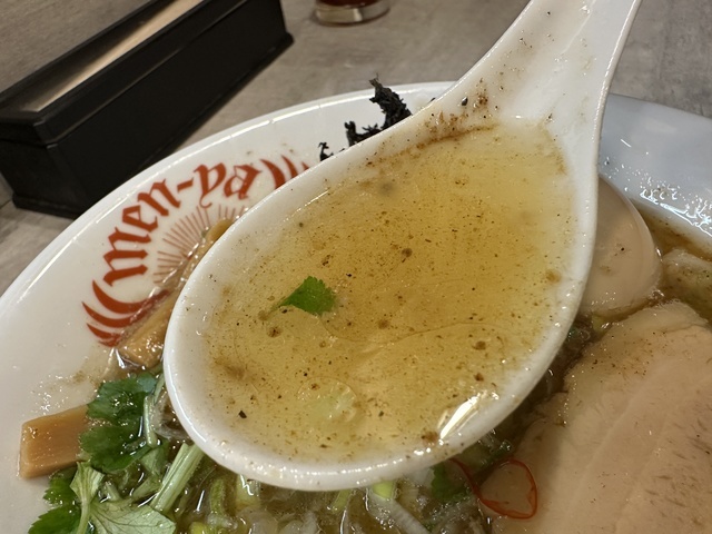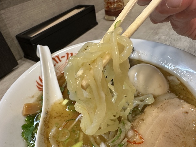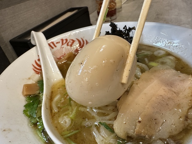 ●2026年3月2日(月) 晴れ。21時45分に訪問し、21時54分に着丼しました。JR高崎駅西口の温度計は11℃を表示しており、夜は冷え込みを感じる気温でした。 ●注文したのは「さば塩らーめん(並盛・麺150g)1,000円」と「味玉120円」。写真撮影の許可もいただきました。なお味玉は「ラーパス」利用で無料に。お冷やを飲みながら待つこと9分、着丼です。 ●トッピング構成、 麺の上には味玉、チャーシュー、メンマ、岩海苔、刻みネギ、ミツバ、糸唐辛子などが彩りよく盛り付けられていました。 ●麺、 もちもちとした食感が心地よい中太平打ち縮れ麺。スープとの絡みも良く、美味しくいただけました。 ●スープ、 油が浮いているものの全体はあっさり。柚子の香りがふわりと広がる塩スープで、非常にバランスが良く美味しい仕上がりでした。 ●チャーシュー、 柔らかく、薄味で食べやすいタイプ。スープの邪魔をせず、全体の調和が取れていました。 ●味玉、 よく煮込まれており、黄身の食感も良好。無料とは思えない満足度でした。 ●健康には良くないと思いつつも、スープを最後まで飲み干しました。 (投稿:2026/03/03 掲載:2026/03/04)