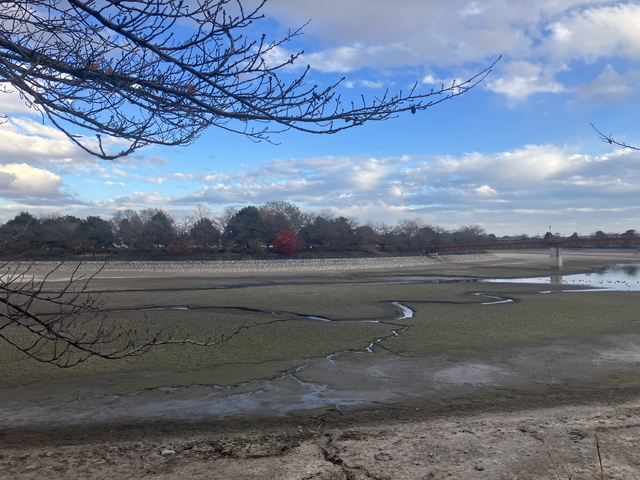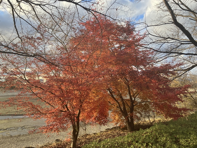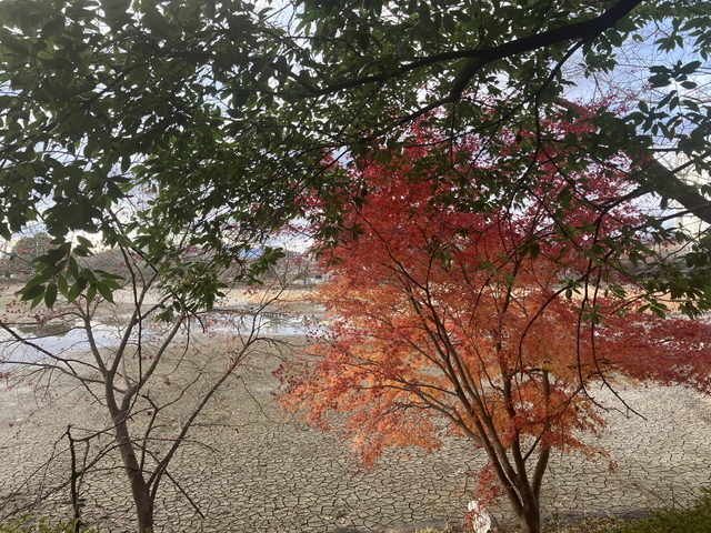 沼の周りを一周ウォーキング。この時期は干上がっています。あちこちで水鳥が羽を休めていました。ほぼ冬枯れの中、わずかに残るモミジがきれいでした♬ (投稿:2025/12/14 掲載:2025/12/15)