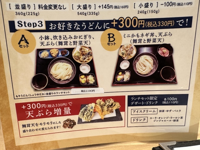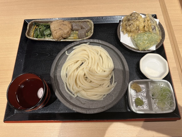 ●2026年2月5日(木) 晴 12:12訪問 12:25着丼。 ●今回は、ランチタイム11:00〜15:00「Aランチセット(小もりうどん麺240g+天ぷら+おにぎり)1,080円」を注文して女性店員に写真撮影の許可を頂きました。 ●テーブル席でお冷やを飲みながら待っていると13分後に発注した「Aランチセット」が着膳しました。 ●先ずは、セットの麺とスープの味見をしてから残りの麺とおにぎり等を食べました。 ●麺は、もちもちして食感の良い太麺で美味しかったです。 ●スープは、出汁がきいてあっさりした冷たい醤油スープで美味しかったです。 ●最初は、麺をスープに付けてそのまま食べて少し食べたらスープに薬味を入れて食べて別の味を楽しみました。 ●健康には、良く無いと思いながらスープを全部飲み干しました。 ●おにぎりは、炊き込みご飯で味付けされていて美味しかったです。 ●天ぷらは、ピーマン、茄子、舞茸の天ぷらが盛り付けてあり、塩を付けて食べたら美味しかったです。 ●代金の支払いでSuicaが使用できてJREポイントが付与されるので大変便利だと思いました。 (投稿:2026/02/07 掲載:2026/02/09)