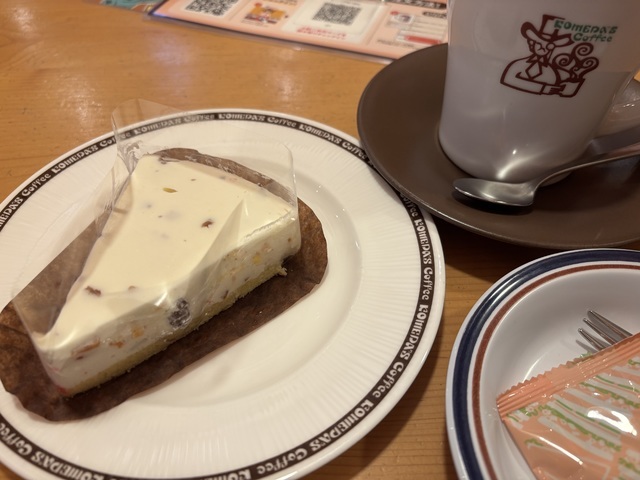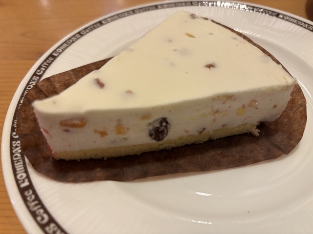 コインランドリーの乾燥を待っている時間にコメダ珈琲さんでブレイク。春の新作ケーキの中でSNSで“反則級の美味さ”と話題になってる「くちどけカッサータ」を食べてきました…噂に踊らされるオジです笑笑。シチリア島の伝統スイーツ「カッサータ」って初体験!なめらかな口どけのリコッタチーズにオレンジピールやレーズンなどのドライフルーツとナッツをちりばめたスイーツです。クリームチーズのコクがしっかりとありますが軽やかな口どけ…中に入ったドライフルーツはそれぞれ個性があって、噛むたびに味わいが変化して楽しい。濃厚なのに重たさがないので罪悪感なしで楽しめました(^^)/500円台で頼めて、ドリンクとセットにすればさらに100円お得…お財布にもちょっとだけ優しい。7月上旬までの期間限定みたいですよ~。【くちどけの 軽さにカロリー 目をそらし】 (投稿:2026/04/17 掲載:2026/04/20)