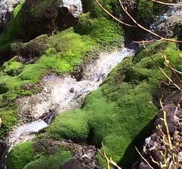 草津の天狗山スキー場から音楽の森を抜けて旧六合地区に入ると、とたんに対向車もなく牧歌的な高原の景色が広がります。手書きの案内板を頼りに行き着いたチャツボミゴケ公園はパンフ写真のベストショットほどではなかったですが(笑)木道に囲まれた群生地は緑のベルベットのようで充分に幻想的でした。レンゲツツジとの競演には少し時期が早すぎたみたいで残念でしたが、コケの段差の中を縫うように流れ落ちる瀬は現世と隔離された別世界みたいです。この辺りの湿原や高原が広がる中之条の最奥部、六合という歴史ある地名も残してほしいですね。 (投稿:2014/05/09 掲載:2014/05/09)