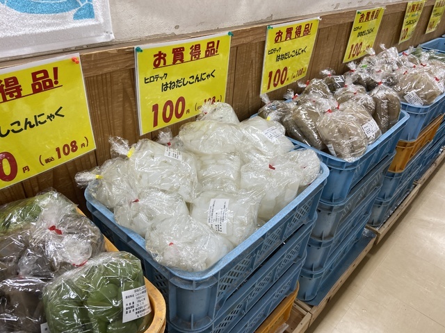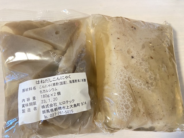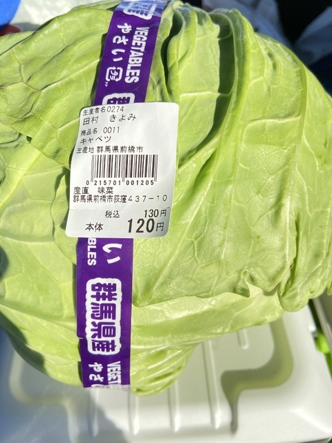 温泉に行ったので、まずは産直でお買い物。大きな群馬県産キャベツ(¥120は安い!!)とこんにゃくとデザートとパンをかいましたー。こんにゃくは各2個入りで100円とお買い得。プリプリして弾力がある良いこんにゃくでした〜。 (投稿:2022/12/06 掲載:2022/12/06)
