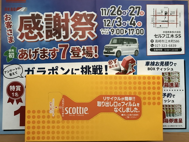 今日からイベント、とチラシを頂いていたので給油に。アンケートに答えてガラポンにチャレンジ、ティッシュボックスを頂きました! (投稿:2022/11/26 掲載:2022/11/28)