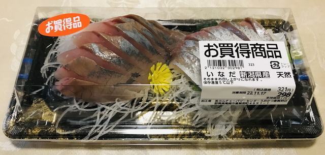 この半年ぐらい魚も随分値上がりして、刺身は「高級品」になってしまいました。。。今日はこちらでお買得になっていた、新潟産いなだの刺身を買って来てもらいました!わざわざもらわなくても、わさびがデフォルトで入っているのがありがたいですね。職人醤油さんの「尾張のたまり」で早速美味しく頂きました♬ (投稿:2022/11/17 掲載:2022/11/18)