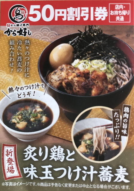 「新登場 鶏つけ汁蕎麦」ののぼりが気になっていてようやく伺えました。メニューを見るとワンランク上の「炙り鶏と味玉つけ汁蕎麦」(税込979円)がぐっと来たのでそちらを。刻み海苔がどっさり載ってやって来ました。ネギも隠れているのでよく混ぜてから、辛めでしっかり濃いつけ汁で。つけ汁の鶏、香ばしい炙り鶏と2種の鶏を楽しみました!最後は味玉で締め。鶏を満喫できてボリューム十分、次回使える50円割引券もゲット。ごちそうさまでした♪ (投稿:2022/11/18 掲載:2022/11/21)