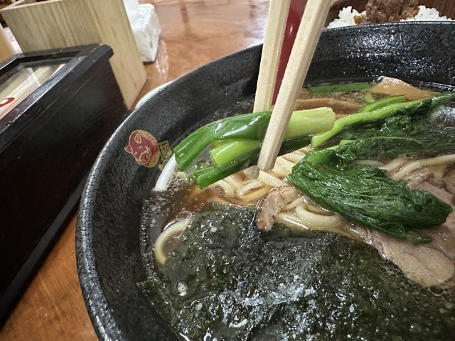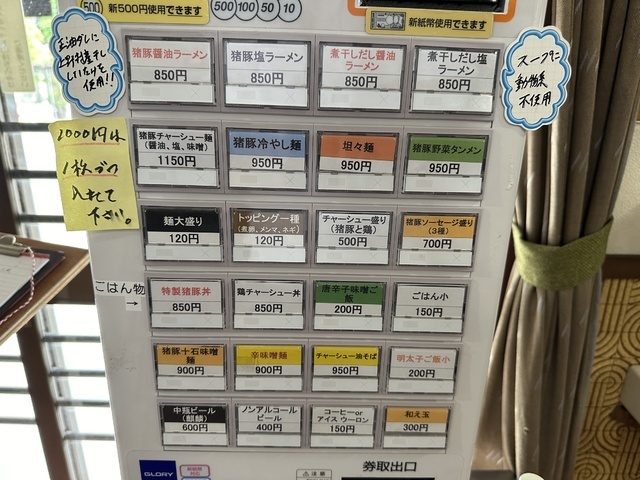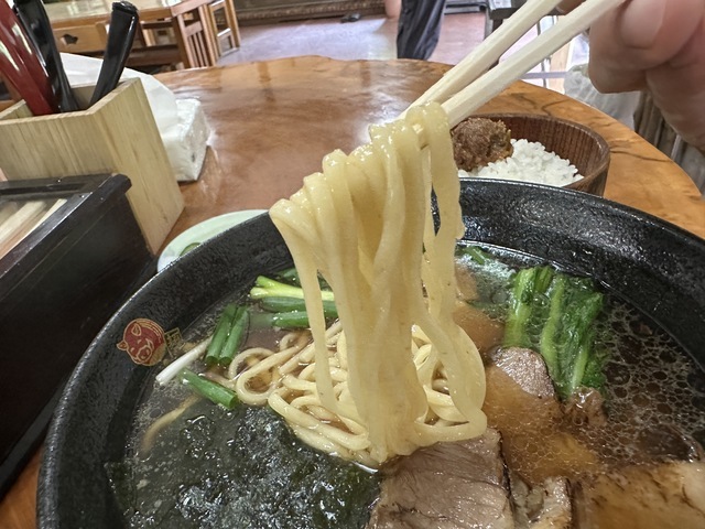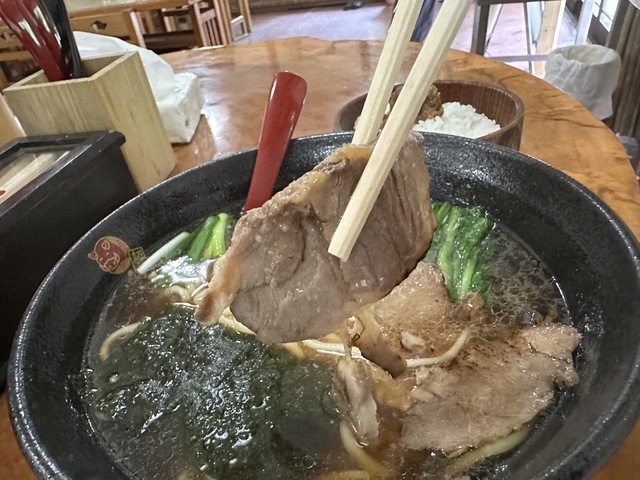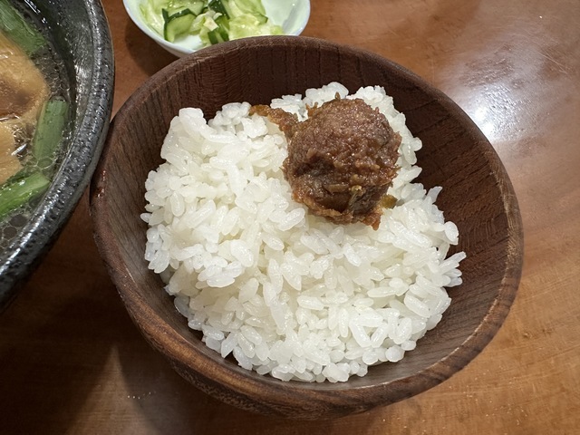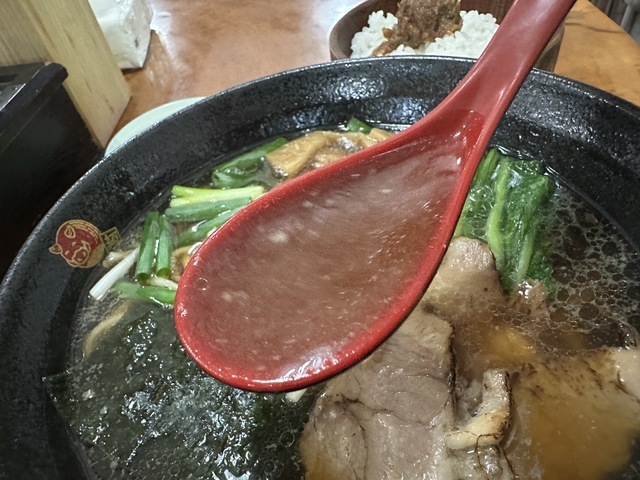 ●2024年7月15日(月) 曇 12:03訪問 12:11着丼。 ●今回は、女性店員に確認したお勧めの「猪豚醬油ラーメン(並盛・150g)850円」と「唐辛子味噌ご飯(小)200円」の食券を購入して写真撮影の許可を頂きました。 ●テーブル席でお冷やを飲みながら待っていると8分後に発注した「猪豚醬油ラーメン」と「唐辛子味噌ご飯」が着丼しました。 ●猪豚醬油ラーメンは、麺の上にチャーシュー、メンマ、青ネギ、菜、のりが盛り付けてありました。 ●先ずは、麺とスープの味見をしてから残りの麺と唐辛子味噌ご飯を食べました。 ●麺は、もちもちして食感の良い自家製の中太縮れ麺で美味しかったです。 ●麺の量は、女性店員に確認したところ150gありました。 ●スープは、あっさりした醬油スープで美味しかったです。 ●チャーシューは、豚のチャーシューとは異なり食感の良い猪豚のお肉を使用したチャーシューで美味しかったです。 ●唐辛子味噌ご飯は、ご飯の上に唐辛子を味噌に練り込んだ味噌がのせてあり美味しかったです。 ●唐辛子味噌ご飯に猪豚醬油ラーメンのスープを入れて食べたら美味しかったです。 (投稿:2024/07/16 掲載:2025/10/30)