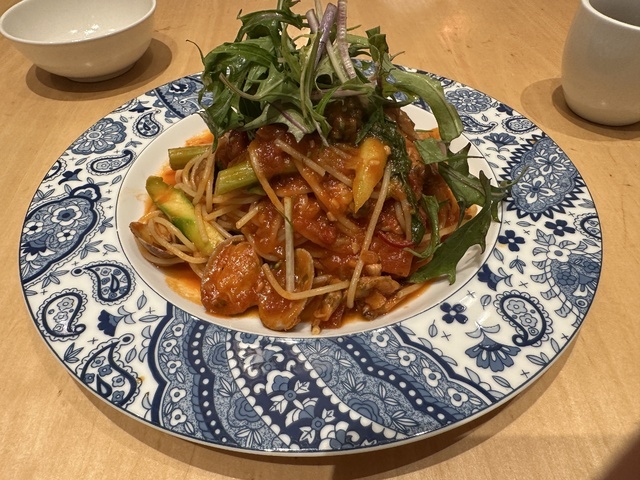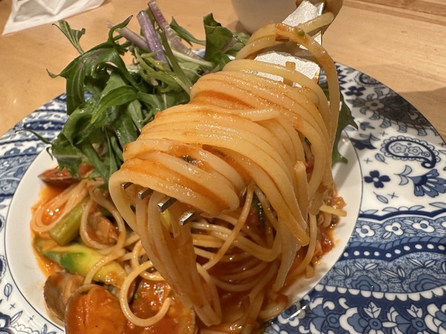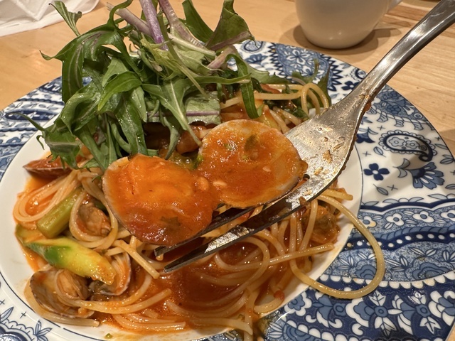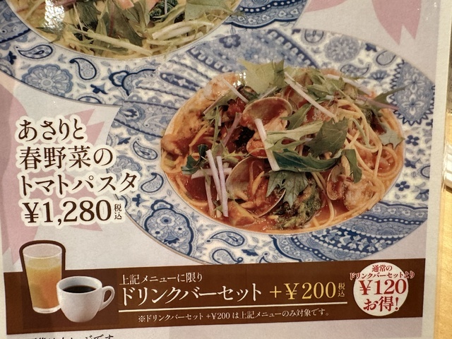 ●2026年3月5日(木) 晴れ。12:10に訪問し、12:27に着皿しました。JR高崎駅東口の温度計は12℃を表示していました。 ●今回は「あさりと春野菜のトマトパスタ(パスタ+バケット2枚)1,280円」と「ドリンクバー」を注文。写真撮影の許可も快くいただけました。 ●テーブル席でスープを飲みながら待っていると、17分ほどでパスタが着皿。あさり、トマト、アスパラガス、水菜などが彩りよく盛り付けられ、春らしい爽やかな味わいで美味しかったです。 ●バケットにトマトソースと具材をのせて食べると、これも相性抜群で美味しくいただけました。 ●ドリンクはホットコーヒーを選択。挽きたてをドリップしているようで、香りが良く美味しかったです。 ●会計ではPayPayが利用でき、さらにヤマダポイントも付与されるため、とても便利だと感じました。 ●他にも魅力的なランチメニューが揃っているので、また訪問したいと思います。ご馳走様でした。 (投稿:2026/03/08 掲載:2026/03/10)