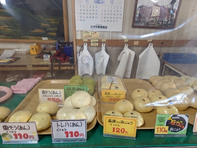 | 名水まんじゅう(あん・味噌・抹茶・ホワイト・うま辛 120円/高菜130円) おやき・野菜(90円) さんしょう煮/ふきのとう煮 | |