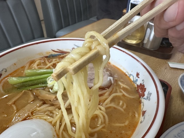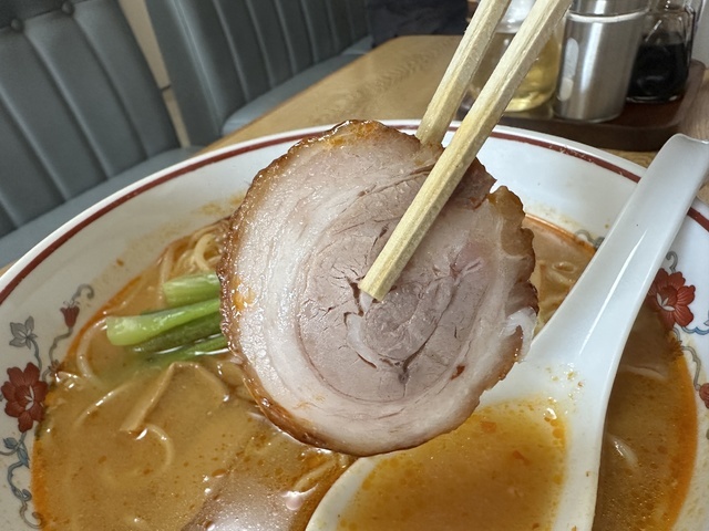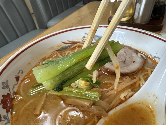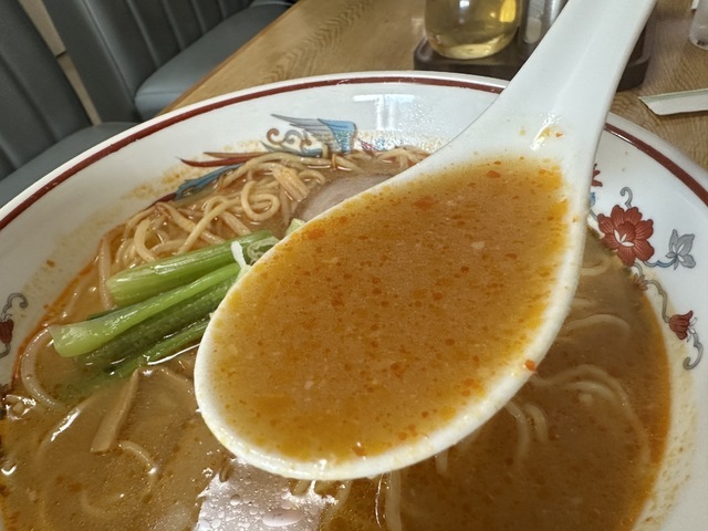 ●2025年144杯目(9月8杯目)の麺研究です。 ●今回は、女性店員に確認したキムタクが食べたらラーメンと同じ「辛みそらーめん(並盛・麺140g)750円」と「餃子(6個)450円」を注文して写真撮影の許可を頂きました。 ●テーブル席でお冷やを飲みながら待っていると着座してから28分後に発注した「辛みそらーめん」が着膳しました。 ●辛みそらーめんは、麺の上にチャーシュー、メンマ、青梗菜、刻みネギ、もやしが盛り付けてありました。 ●先ずは、麺とスープの味見をしてから残りの麺と餃子を食べました。 ●麺は、もちもちして食感の良い中太縮れ麺で美味しかったです。 ●麺の量は、ボリューミーに感じましたが女性店員に確認したところ、140gありました。 ●スープは、少し甘くてピリ辛の味噌スープで美味しかったです。 ●チャーシューは、大きくて柔らかくて薄味のチャーシューで美味しかったです。 ●健康には、良くないと思いながらスープを全部飲み干しました。 ●餃子は、薄い皮の中に具がたっぷり入っている餃子で美味しかったです。 ●代金の支払いでd払いが使用できるので大変便利だと思いました。 (投稿:2025/09/28 掲載:2025/09/29)